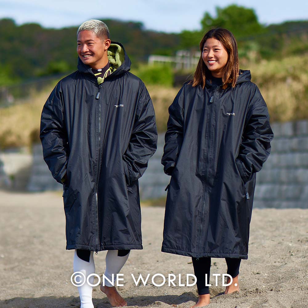 冬のマリンスポーツ、自転車・バイクや徒歩によるビーチまでの移動、サーフィン大会などで待機をする際など、数多くのシーンで大活躍するアウタージャケット(ベンチコート)。