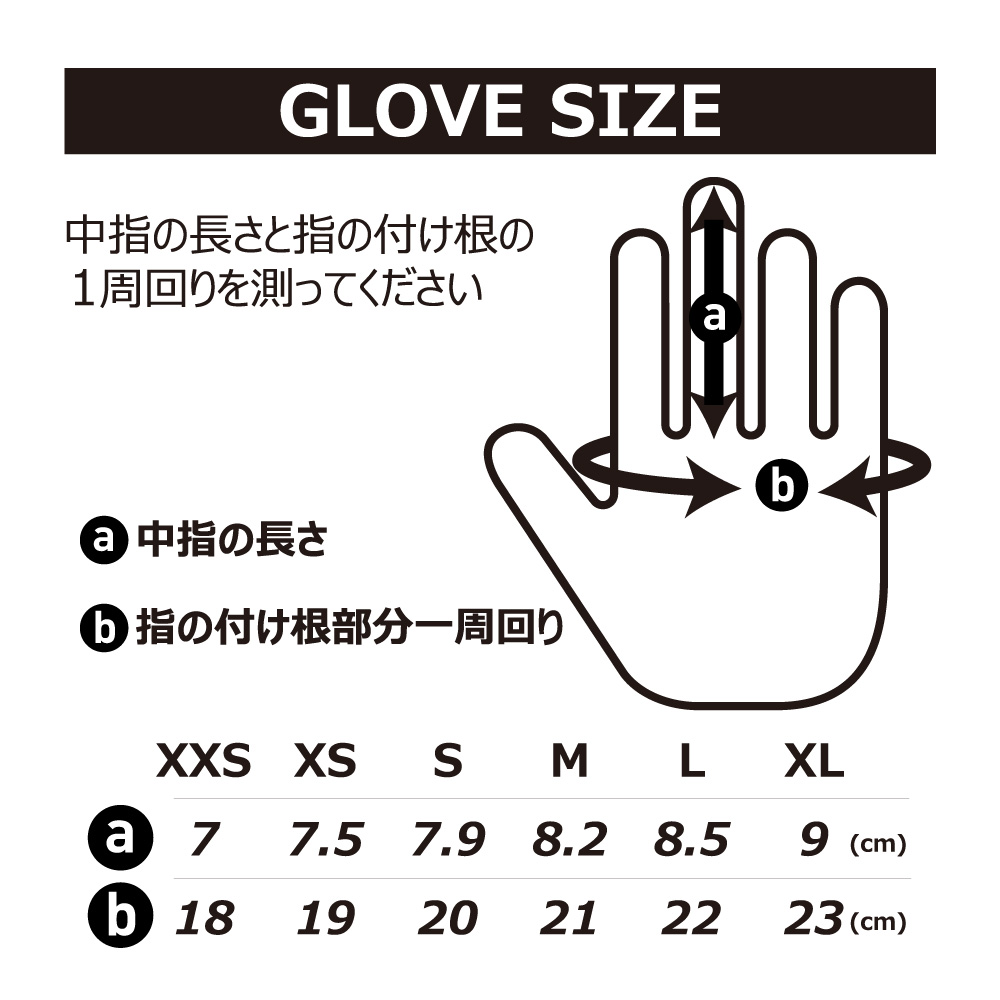 手のひらを広げた状態で、親指と小指の間の長さ(付け根部分を1周)が基準となります。